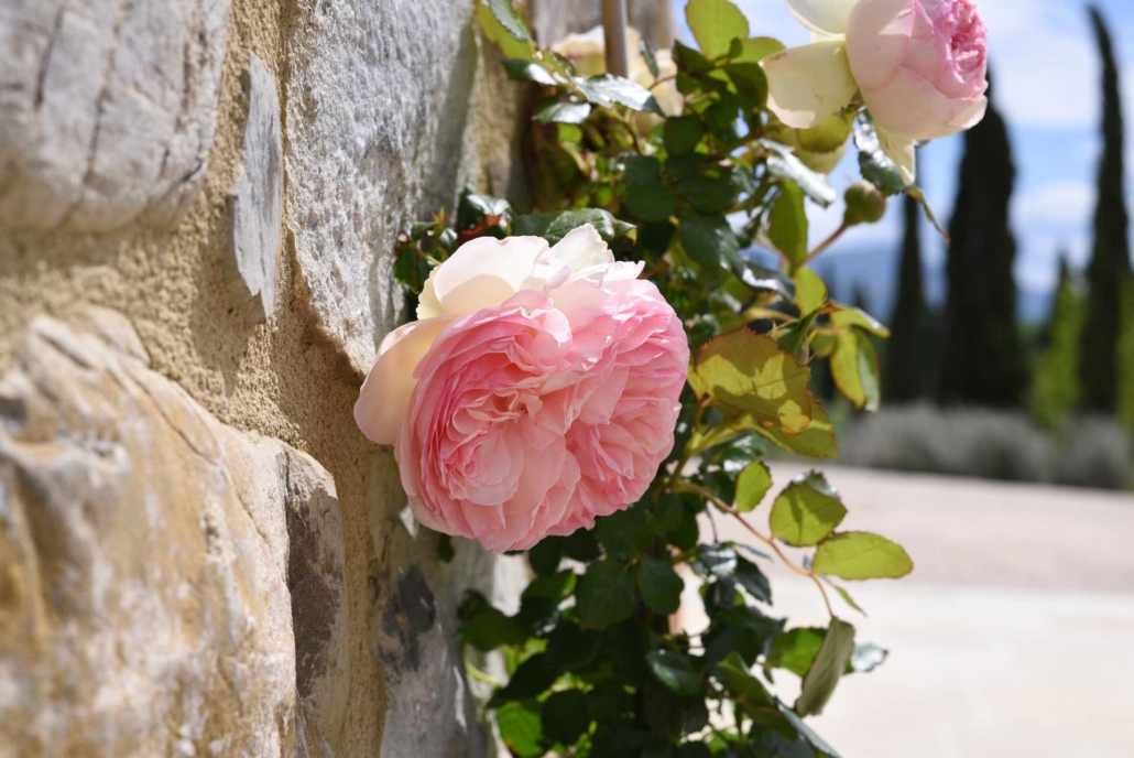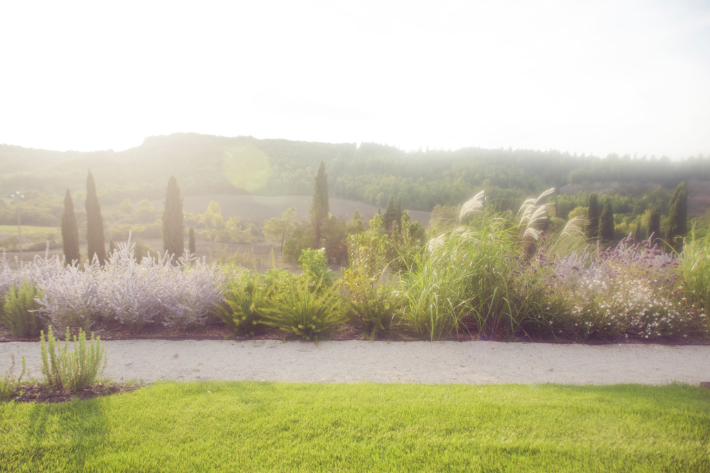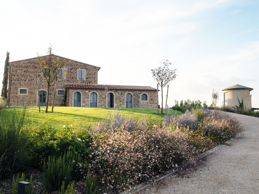 Il poggio intorno al casale costituisce la porzione più disegnata, come se la casa stessa si estendesse con un differente gradiente verso l’esterno. Qui si aprono nuove “stanze” sul paesaggio: la corte centrale con i vasi di limoni e i bordi di ortensie e lavande, la pergola del tramonto che guarda sulla collina di Castelvecchio e il pergolato di rose e Trachelospermum jasminoides della zona pranzo che traguarda la riserva naturale di Lucciola Bella.