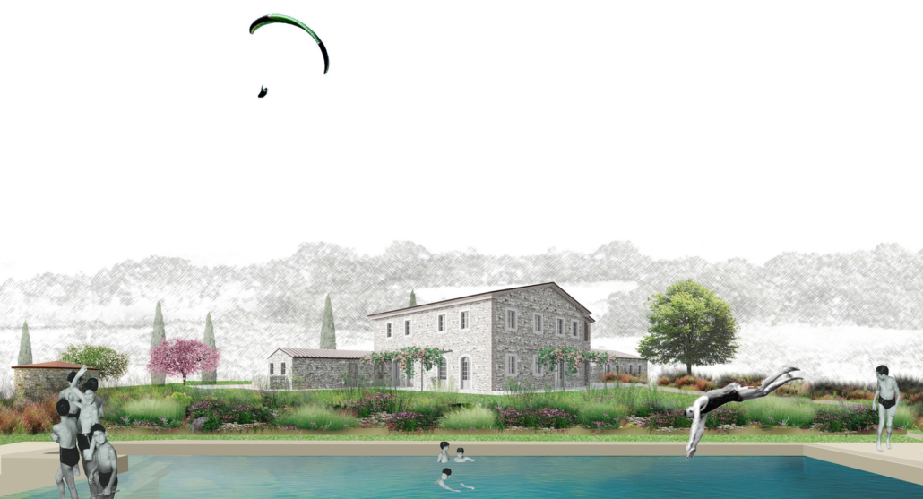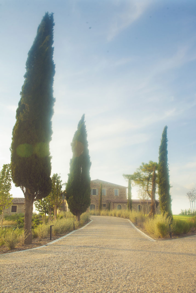 Un uliveto e un lago, utilizzato come riserva d’acqua, completano il disegno del giardino. Alberi, perenni ed erbacee sono stati attentamente selezionati al fine di conservare il carattere autentico del casale, scegliendo specie autoctone e allo stesso tempo studiando l’inserimento di nuove varietà che dipingono con fiori e foglie il giardino durante tutte le stagioni.