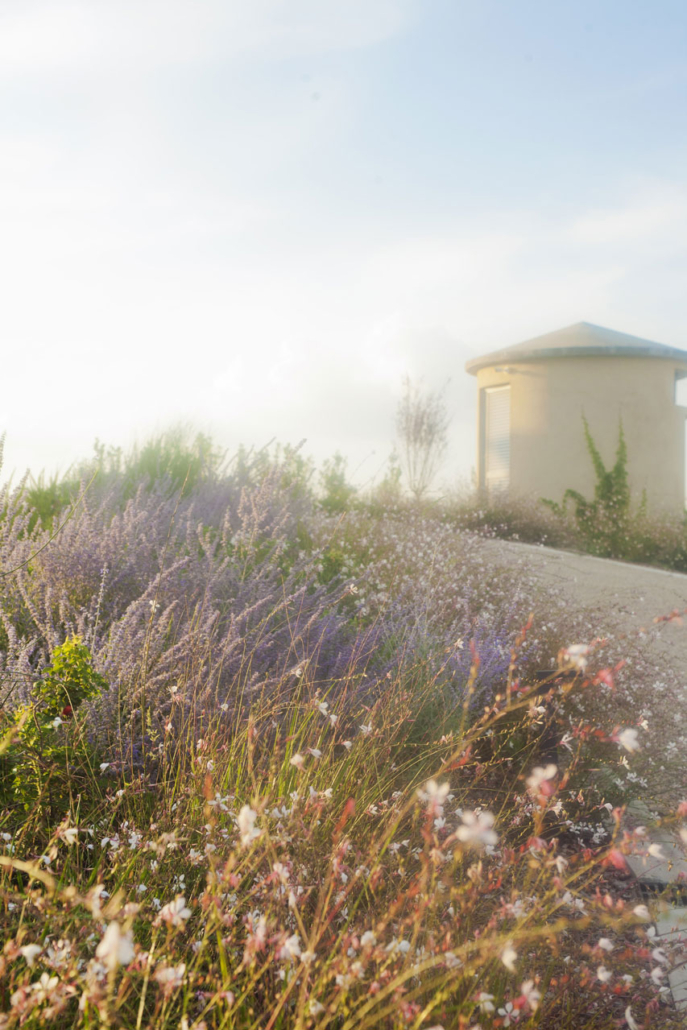 Il progetto si autodefinisce con pochi segni che valorizzano l’architettura e invitano a un senso di scoperta del giardino stesso e del paesaggio che lo circonda. I passaggi, gli accessi, l’alternanza di superfici a prato con piante arbustive e tappezzanti, le leggere variazioni della topografia completano l’organizzazione spaziale del giardino.
