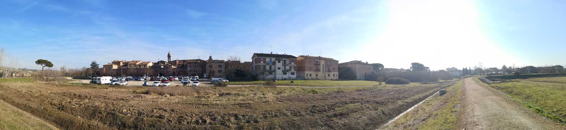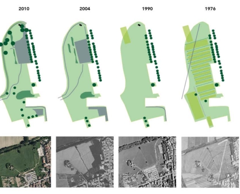 Da un punto di vista paesaggistico l’area presenta alcuni caratteri di notevole interesse per il suo duplice dialogo con il paesaggio del fiume Ombrone, caratterizzato da seminativi aperti, e quello della città con la sua cinta muraria. Dall’analisi dei documenti storici e della successione delle foto aeree è stato possibile ricostruire le principali fasi di trasformazione di questa area negli ultimi settant’anni.