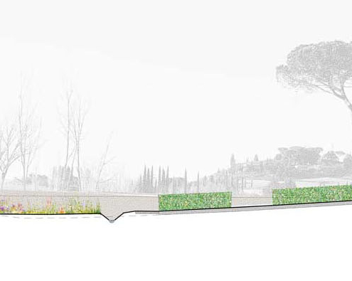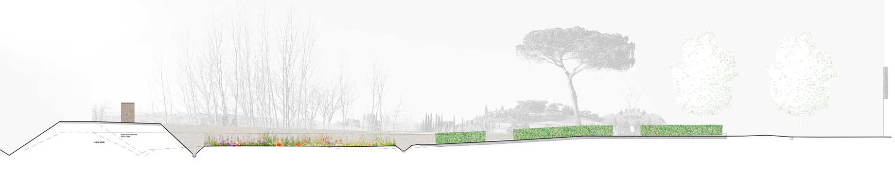 L’area del parcheggio è ripensata come un invito verso il nuovo parco fluviale: l’asse centrale che connette idealmente la porta delle mura storiche con l’argine e il fiume, crea uno spazio pubblico pedonale che dalla città porta al parco fluviale. E’ stato inoltre previsto un sistema di bioritenzione naturale della acque volto a garantire un adeguato assorbimento delle acque e un primo sistema di filtraggio naturale . Un sistema di fossi di infiltrazione inerbiti è infatti collegato ad una maglia ortogonale di trincee drenanti dotate di tubi drenanti che portano l’acqua non assorbita al fosso di infiltrazione principale in fondo al parcheggio.