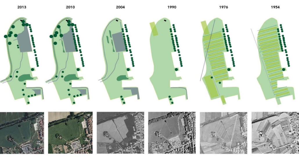 Da un punto di vista paesaggistico l’area presenta alcuni caratteri di notevole interesse per il suo duplice dialogo con il paesaggio del fiume Ombrone, caratterizzato da seminativi aperti, e quello della città con la sua cinta muraria. Dall’analisi dei documenti storici e della successione delle foto aeree è stato possibile ricostruire le principali fasi di trasformazione di questa area negli ultimi settant’anni.